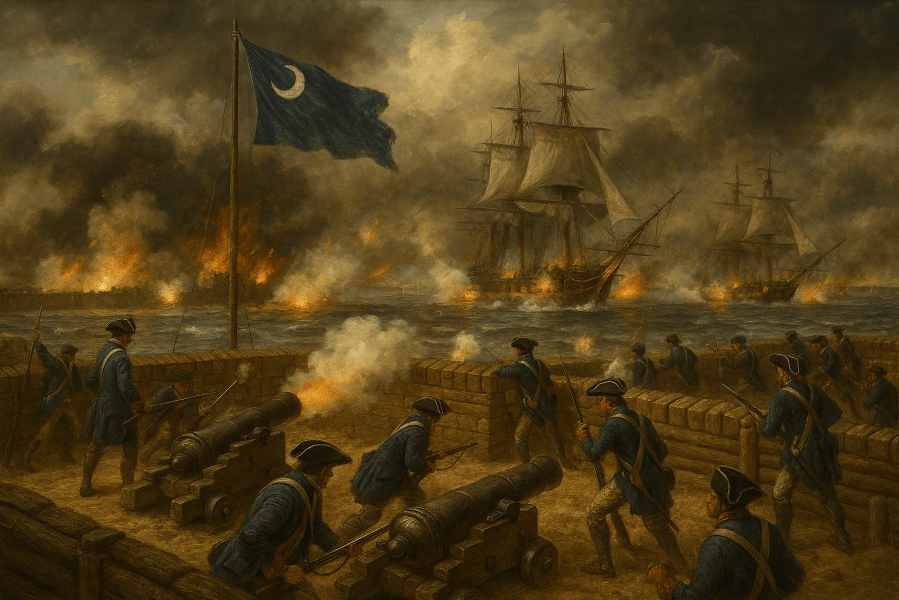 The battle is about to begin. On one side is the British armada with a fleet of nine mighty men-of-war bristling with 300 heavy guns. On the other stands the flimsy-looking palmetto log fort of the Americans with 31 cannons.